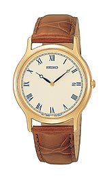 You Save : 44% Seiko Men's SKP332 Dress Brown Leather Strap Watch A clean, classic timepiece, this Seiko Men's Dress Watch is perfect for elegant evenings or everyday wear. Featuring a round, champagne dial with Roman numeral indices, a convenient date window at three o'clock, and trim, black hour and minute hands, all protected by a durable hardlex crystal, this watch utilizes reliable Japanese quartz movement. Also offering a 34-millimeter case and stationary bezel crafted from brass, a rich brown leather band, and a buckle clasp, this versatile watch is water resistant to 330 feet.